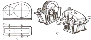 цилиндрическими зубчатыми колесами:а - кинематическая схема: б - общий вид