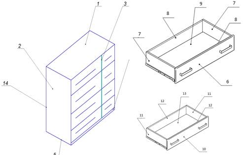 ящика; 10 - фасад ящика; 11 - боковая стенка ящика; 12 - задняя стенка ящика;