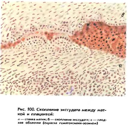 плацентой: а - стека матки; б - скопление экссудата; в - плодная оболочка