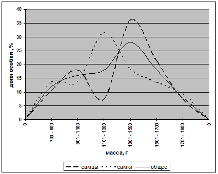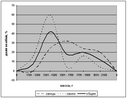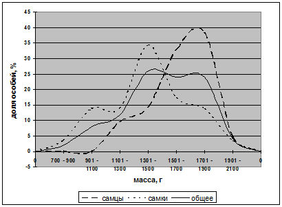 рыбы массой от 1301 до 1500г (42%); в 2010 году - от 754 до 1778г. Модальный