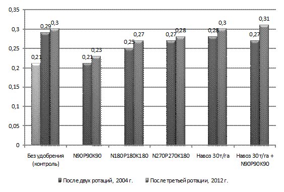 составляющей удобрения (навоз 30 т/га + N90P90K90) привел к увеличению этого