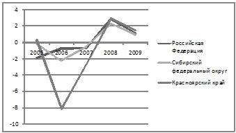 синхронизация темпов изменения в РФ, СФО и Красноярском крае, но в 2009 г. рост