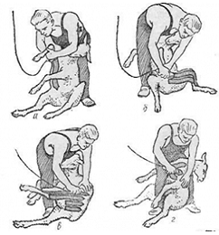укладывают на стол, на левый бок, спиной к стригалю и фиксируют тело так, чтобы