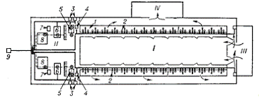 окунателя и выходных дверок; 13 - выходные дверки; 14 - отстойники; 15 -