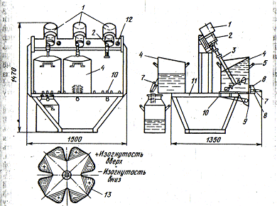 электродвигатели; 2 - редуктор; 3 - вал мешалки; 4 - бачки, 5 - ручка бачка; 6