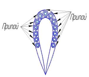 припаяны на ребро к поверхности металла, а поверх них, образуя второй ярус,