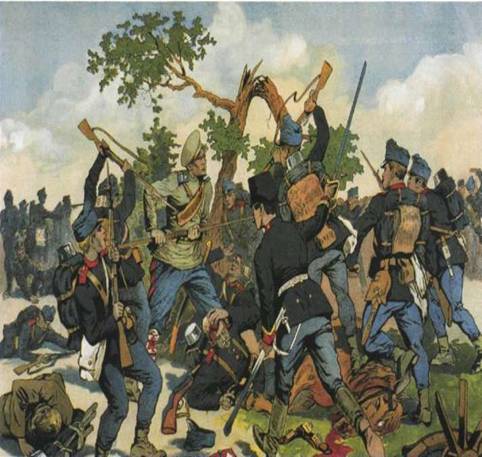 раздробленной ногой продолжая биться, заколол трех австрийцев пикой, а затем,