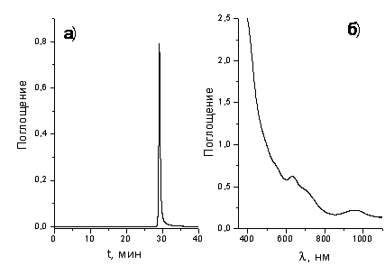 толуоле: (а) ВЭЖХ хроматограмма (колонка Cosmosil Buckyprep, скорость элюента