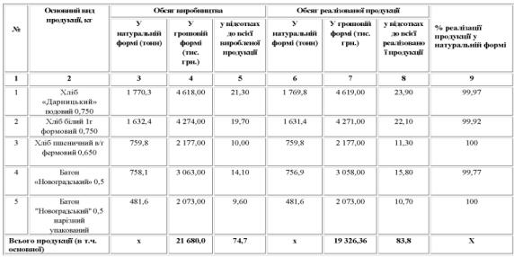 г. - обсяг реалізації 100%; хліб «Дарницький подовий» 750 г. - 99,97%, хліб