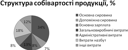 сировина (34%), витрати на збут (18%), загальновиробничі витрати (13), інші