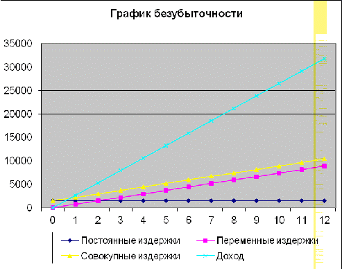представлен анализ денежных потоков и график безубыточности.