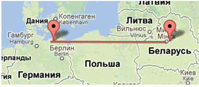 Минск, затем авиатранспортом из Минска в Росток, расстояние 98 +993=1091 км.
