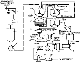 горячего солода, откуда он самотеком поступает на расткоотбойную машину 21.