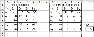 получим оптимальный план перевозок при k=0 (рисунок 4.3.6.).