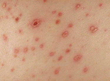 оспины на коже головы, лица, туловища и конечностей, которые проходят стадии