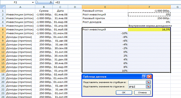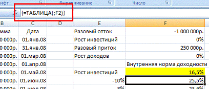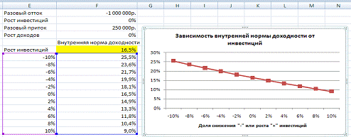 графика чувствительности внутренней нормы доходности от роста / уменьшения