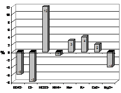 головні іони, до яких належать SO42-, NО3-, Cl-, НСО3-, NH4+, Са2+, Mg2+, Na+,