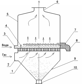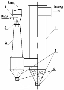 В горловину аппарата подается вода. Поступающий газопылевой поток вводится в
