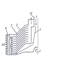 полый вал; 2 - корпус; 3 - коническая тарелка; 4 - слой осадка; I - вход жидкости; II -
