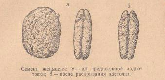 женьшеня сжаты сверху и с боков и содержат две светло-желтые косточки. Семя