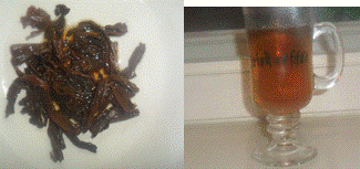 темный не прозрачный настой, очень крепкий аромат и терпкий вкус, сильно