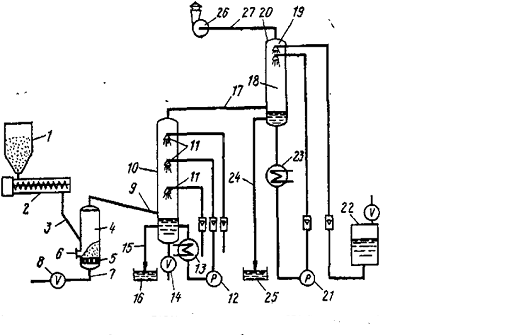 12-насос, 13-теплообмінник, 15-вентиль, 17-труба для відводу газів, 18-насадка,