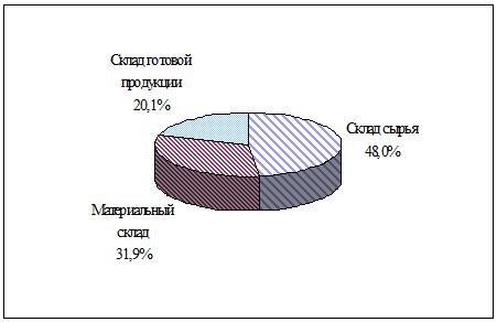 складских площадей, материальный склад занимает 31,9%, а склад сырья 48,0%.
