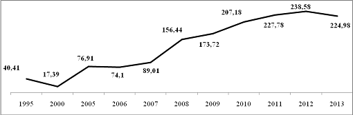 Рис.1. Динамика бюджетного финансирования науки в 1995-2013