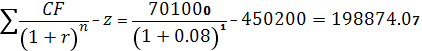 (256400/(1+0.08)1)+ (256400/(1+0.08)2)+ (256400/(1+0.08)3) - 576900 =