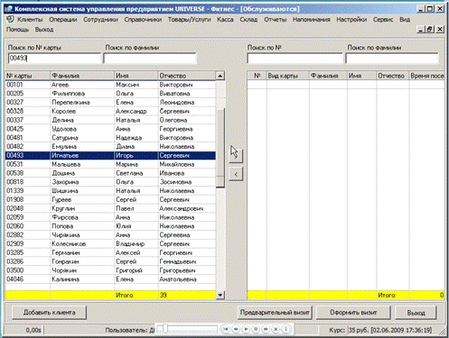 можно заметить, что в программе UNIVERSE-Фитнес выпадающее меню содержит