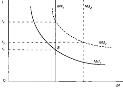 предложение денег; Е - точка равновесия денежного рынка; i - равновесная процентная ставка.