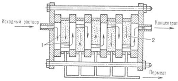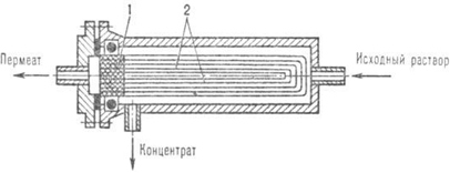 исходная вода; 2 - выход концентрата; 3 - выход фильтрата (пермеата);4 -