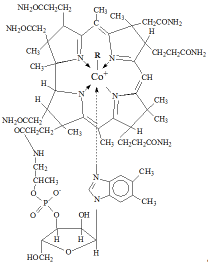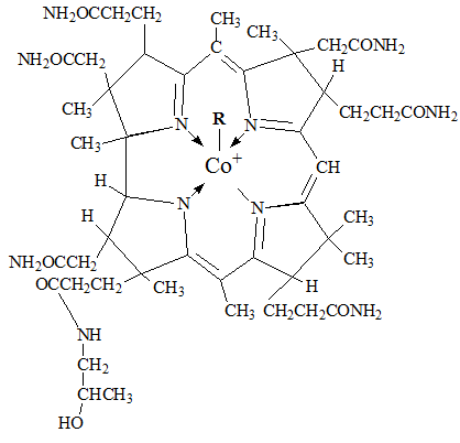 является кобаламин (витамин В12). Атом кобальта в кобаламине (Cbl)