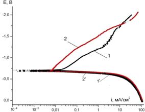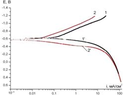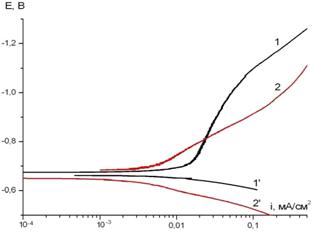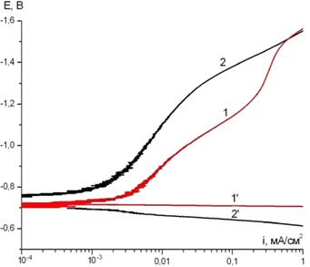 у розчинах NACE (1, 1’) та 5% NaCl + 0,5% CH3COOH (2, 2’)