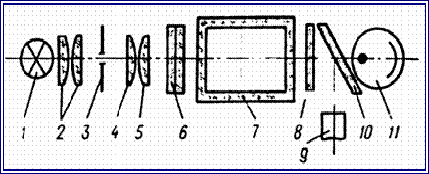 5-вогнутое зеркало; 7,8- объектив; 9-кюветы; 10- линзы; 11- приёмник.