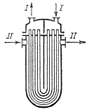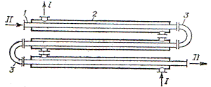 при чому, один із теплоносіїв (І) рухається по трубам, а другий (II) - в