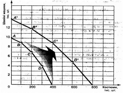 ресурсів не дає змоги одночасно збільшувати виробництво обох продуктів.