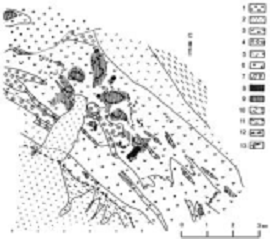 палеозойские гнейсы; 12 - зона надвига; 13 - карьеры