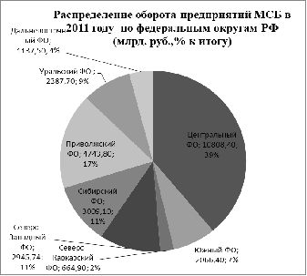 оборота предприятий МСБ в 2011 году по федеральным округам РФ (млрд. руб.,% к
