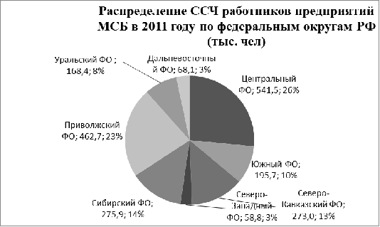 работников предприятий МСБ в 2011 году по федеральным округам РФ (тыс. чел. к
