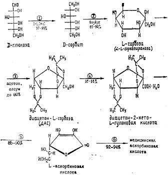 аскорбиновой кислоты из D-глюкозы. Включает 5 стадий, в том числе 3 химических.