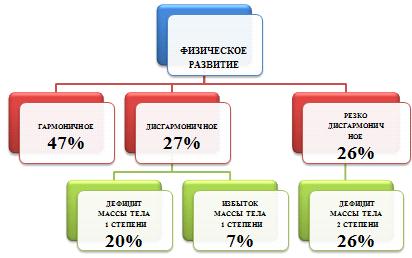 что 52 % детей имеют гармоничное телосложение, 30 % - дисгармоничное, из них 15