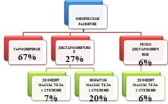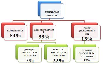 % с дефицитом массы тела и 15 % с избытком, и 18 % - резко дисгармоничные.