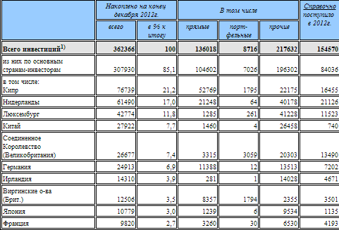 конец 2012г. накопленный иностранный капитал в экономике России составил 362,4