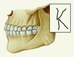 нижней челюсти смещается кнаружи, становясь таким образом под углом к