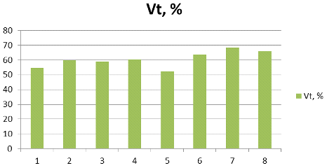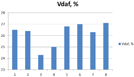 Рисунок 13 - Диаграмма выхода летучих веществ, %/группа фабрик