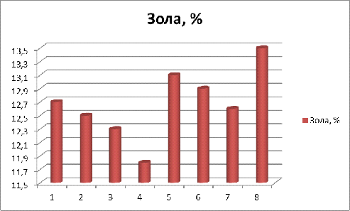 Рисунок 14 - Диаграмма содержания золы, %/группа фабрик