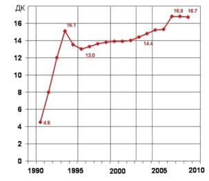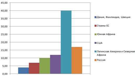 динамика в России с 1990 по 2010 гг., сравнительная диаграмма для ряда стран.