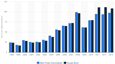 http://www.statista.com/statistics/209641/average-annual-spot-price-of-wti-and-brent-crude-oil/