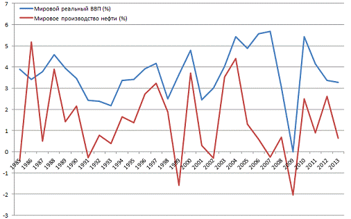 (Среднегодовые WTI и Brent спотовые цены на нефть с 1990 по 2013)